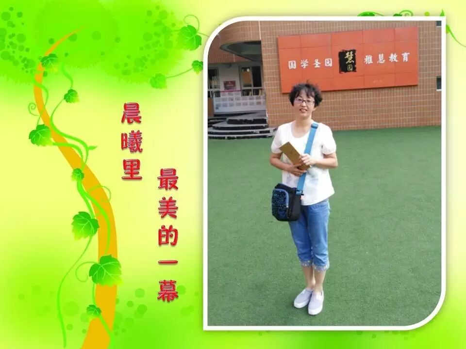 就在这样一个美丽的清晨里,我被幸福深深地包围着,感染着,此时学校小路上那一片片随风飘落的黄叶引起了我的深思,这晨曦里最美的一幕也再次勾起了我——一位母亲记忆中那朵小小的浪花:在清晨的小路上,牵着孩子的小手走过一个又一个美妙的时光。尽管这一幕已离我远去,但我仍旧会和现在年轻的父母们一起分享那曾经晨曦里最美的一幕,我依旧会在每一个清晨分享着孩子们那颗闪亮的童心,聆听他们甜美的童音......让这最美的一幕照亮我的教育之路。