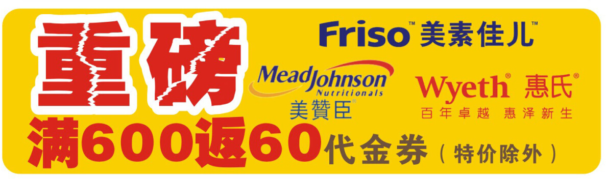 买以下奶粉满600元(同品牌)返60元代金券(特价除外):