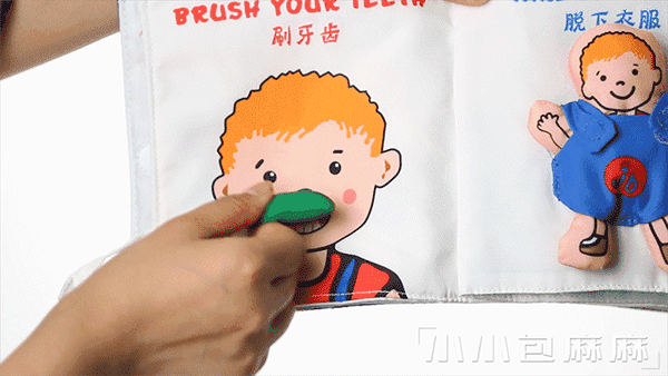 第4页,一个刷牙的场景,立体造型的牙刷,帮助宝宝拿捏感受刷牙。让宝宝养成吃完东西要养成刷牙的良好习惯。