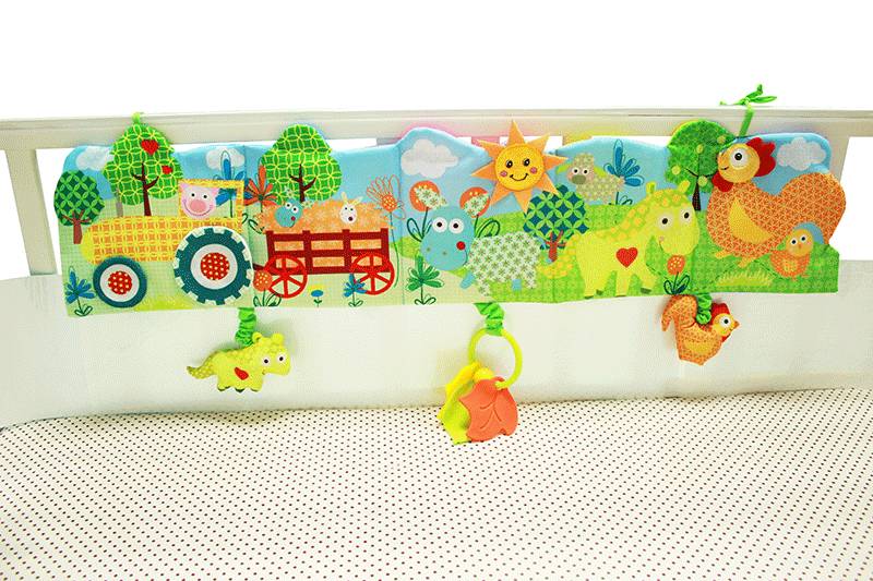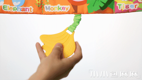以农场素材为主题,正反面分别是不同的农场常见场景与素材,小马、公鸡、农车、猫头鹰、蜜蜂、小鸟等等。色彩搭配符合小宝宝们的审美,颜色过度自然。小马振动器、树叶牙胶、小鸡BB器方便宝宝拉撤啃咬,可以吸引宝宝注意力,并锻炼宝宝的精细动作。