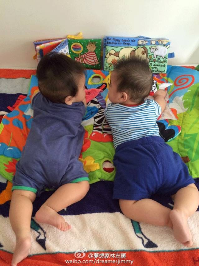 双胞胎一人一本趴着看,边读边交流哈(来自林志颖微博)