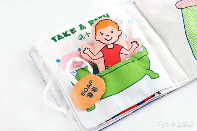 第6页,采用立体天窗造型,制作的浴缸,可以放入小男孩,拿出香皂给他洗个澡,帮助宝宝养成每天都要洗澡的习惯。