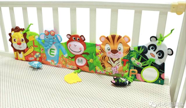 长颈鹿床围布书,一面是以森林小动物为主题,一面是以海洋动物为主题,可以给宝宝不同视觉刺激,吸引宝宝注意力。和狮子床围布书一样有兔子震动器、树叶牙胶、小羊BB器。