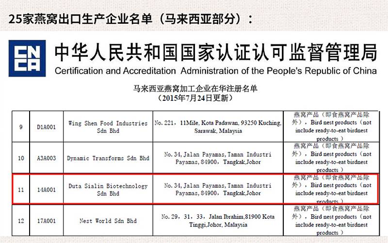而且加工企业是 Duta Sialin Biotechnology Sdn.Bhd./谢琳燕窝(马)有限公司,,。