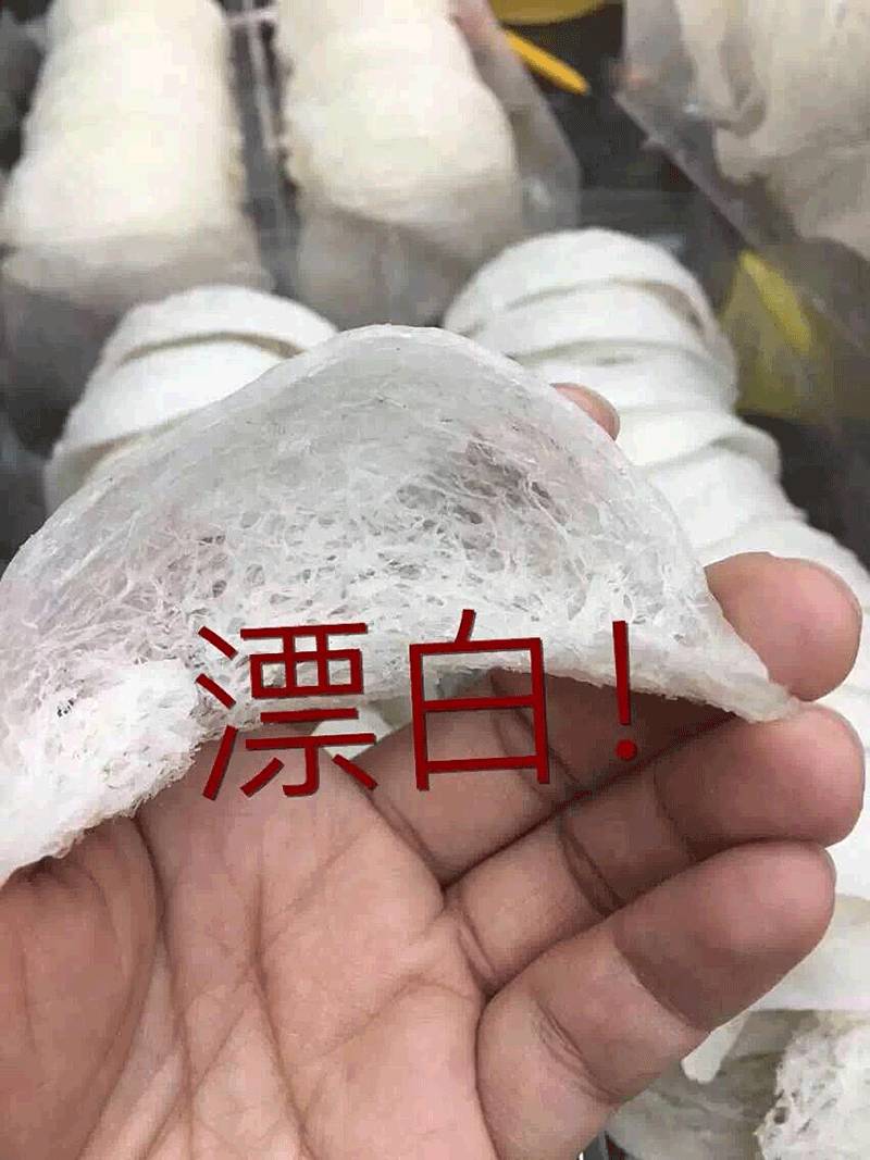 人工挑毛的损耗大,首先要把下图这种囊丝去掉。用漂白剂、双氧水漂白就“节省”多了……