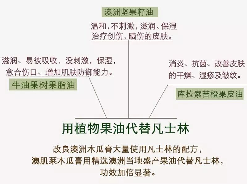 澳肌莱的这款番木瓜膏还有一大特点就是用植物果油代替凡士林,所采用的都是澳洲盛产的上等植物果油,不仅安全好用,功效也更加显著。