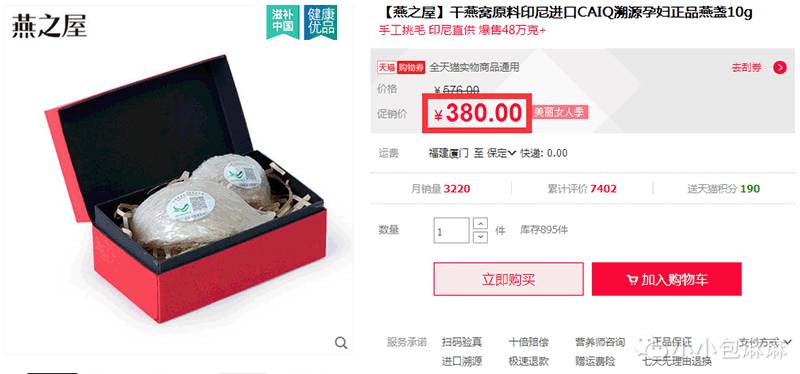 和我之前买过的燕窝相比,先和妞儿们说一下价格上的区别,楼上印尼金丝燕燕盏是满一斤可以按批发价走,批发价每两2160港币,合算人民币每克45.7元;燕之屋印尼燕盏12g 456元,每克38元;同仁堂马来西亚燕盏10g 568元,每克56.8元;亲滋味马来西亚金丝燕燕盏15g 淘宝售价599元,每克39.3元。给大家争取到了439元包邮的团价,这样算下来每克29.3元,必须囤货的节奏。