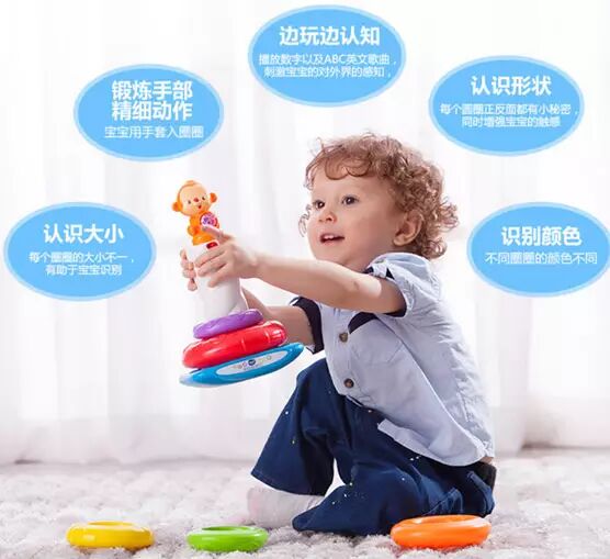 这一阶段的宝宝走得更快,学会跑,会停下和弯腰。他们对爬的渴望是无法阻止的,所以爸爸妈妈要给他们营造一个安全的爬行空间。此时他们喜欢和爸爸妈妈一起玩身体接触的游戏,比如拍手游戏,骑大马,或者在爸爸身上爬来爬去。宝宝的手部技能进步后,可以让他玩更有挑战性的玩具,这种套圈玩具也能挑战宝宝日益发展的大脑。