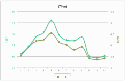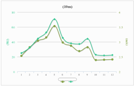 月平均风速3.87m/s,其中5月风速最大,4月次之,而1月、8月、10月、11月、12月风速最小。风速与风功率密度变化趋势一致,风能密度最大约为129.54W/m²,最小约为47.06 W/m²。
