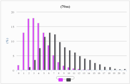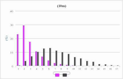 根据项目所在地全年风速和风能频率分布图3可知,10m高度处风速在0、1、2、6、7、13m/s出现的频率较高,总和为31.63%;风能在4、5、6、7、8、9m/s出现的频率较高,总和为66.04%;测风塔70m 高度处风速在2、3、7、12、13、14m/s出现的频率较高,总和为29.36%;风能在4、5、6、7、8、9m/s 出现的频率较高,总和为61.84%。
