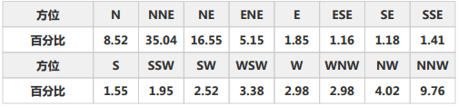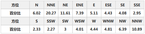 表4和表5分别为项目所在地多年平均风向频率和风能频率统计表,由该表做出的风向和风能玫瑰图见图4和图5。图表结合可知,项目所在地的主导风向为NNE(东北偏北风),占比20.27%。盛行风能方向与主导风向一致。