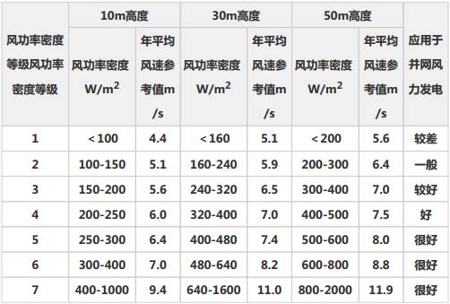 ,全国陆上50米高度层年平均风功率密度大于等于300 W/m²的风能资源理论储量约73亿千瓦,80米高度的风能资源技术开发量为91亿千瓦,截至2010年底,中国风力发电累计装机容量达到4182.7万千瓦,首次超过美国,跃居世界第一。根据国家能源局发布的数据,到2012年底,全国(不含港、澳、台)共建设风电场1445个,风电场的分布遍布全国。到2015年底,全国累计装机容量1.45亿千瓦。风功率密度是风场风能资源的综合指标,按照国家标准《风电场风能资源评估方法》(GB/T18710-2002)风功率密度等级见表1。应注意表1中风速参考值依据的标准条件(见表1的注1、注2)与风场实际条件的差别。