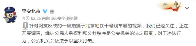 随后,北京市公安局官网微博@平安北京 的评论区便被关心此事的网友占据,不少网友都在询问地铁上侮辱女孩的男子是否抓到,警方是否关注此事。平安北京针对网友评论作出回应表示,警方已关注此事,并开展核查。