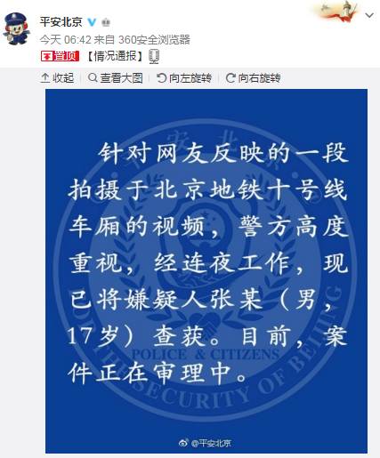 昨天,北京警方发布情况通报:警方已将嫌疑人张某(男,17岁)查获。目前,案件正在审理中。