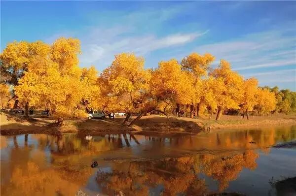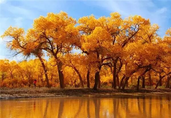 额济纳金黄璀璨的胡杨林,屹立在苍茫的沙漠中,与广阔无垠的蓝天为伴,恍若梦境一般的存在,是摄影爱好者的天堂。