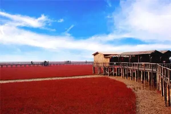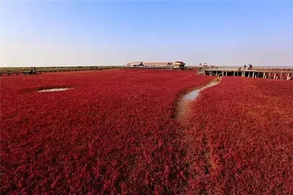 漫步于红海滩的木栈道之上,眺望似火的碱蓬草在海岸线上于天空相接,红海滩在冬天就会枯萎变黄,只有在秋天才能看到它最惊艳的模样。