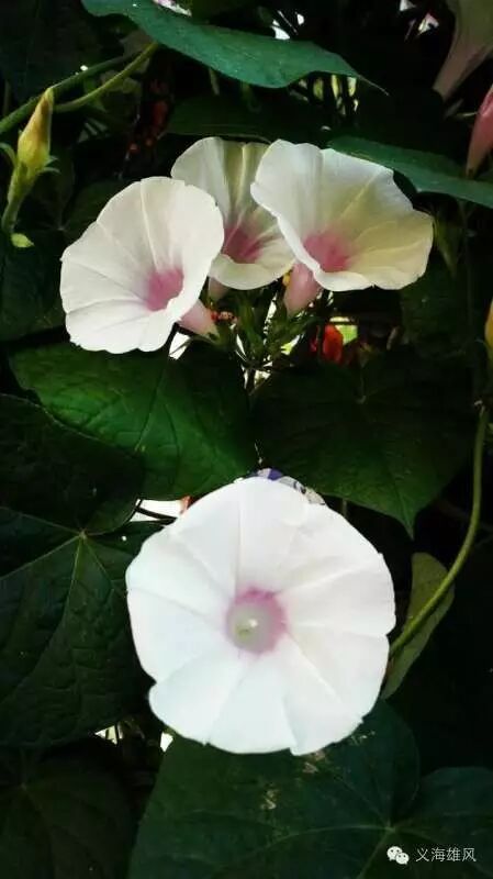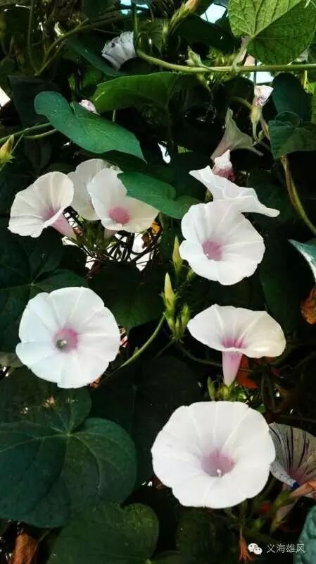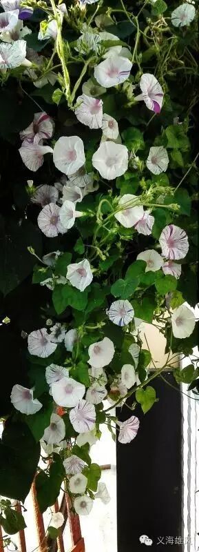 也许会有人说,朝颜攀附倚贵,自无力向上靠依附强力作为支撑,攀跃高端炫耀人前。这对朝颜来说有失公允,朝颜生来就是蔓草植物,柔软无骨,少了一份木质的刚硬。“茎柔叶软难独立,一束衰草也相倚。”没有攀龙附凤之说,这是朝颜生命之本能使然。“身弱心不弱,‘’努力,拼搏,自强不息贯穿朝颜整个生命花期。“一朝屋檐上,晋升万户侯。”一旦漫上墙头,高楹,篱笆墙,绿色瀑布花似锦,倾世繁华谢恩情。你若有情,我便不弃;你若有心,我便有义。这是朝颜的心声,也是朝颜的生平。有时想,不管是牵牛花,喇叭花,还是朝颜,还不如叫“女人花”来的妥帖,就像行走世间的每一位女子,你若许她一生祸福担承,生死相依,给她一个支点,她届时许你一世欢颜,坐拥温柔满怀,岁月沉香。以恬淡的模样轻拥欢笑,来疏散秋露带来的薄凉;以柔情缱绻的滚烫来熨平你心灵的帐惘。