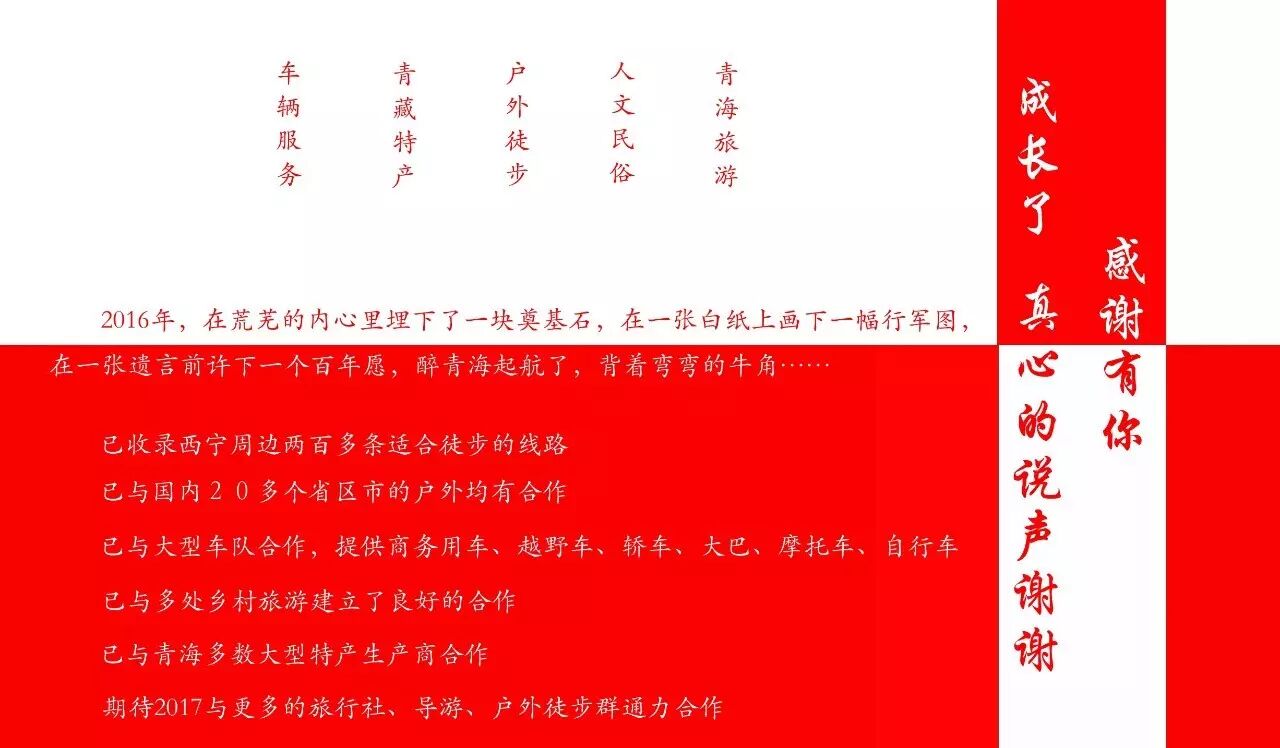 2016年,在荒芜的内心里埋下了一块奠基石,在一张白纸上画下一幅行军图,在一张遗言前许下一个百年愿,醉青海起航了,背着弯弯的牛角……为了那个曾经拥有的美好。