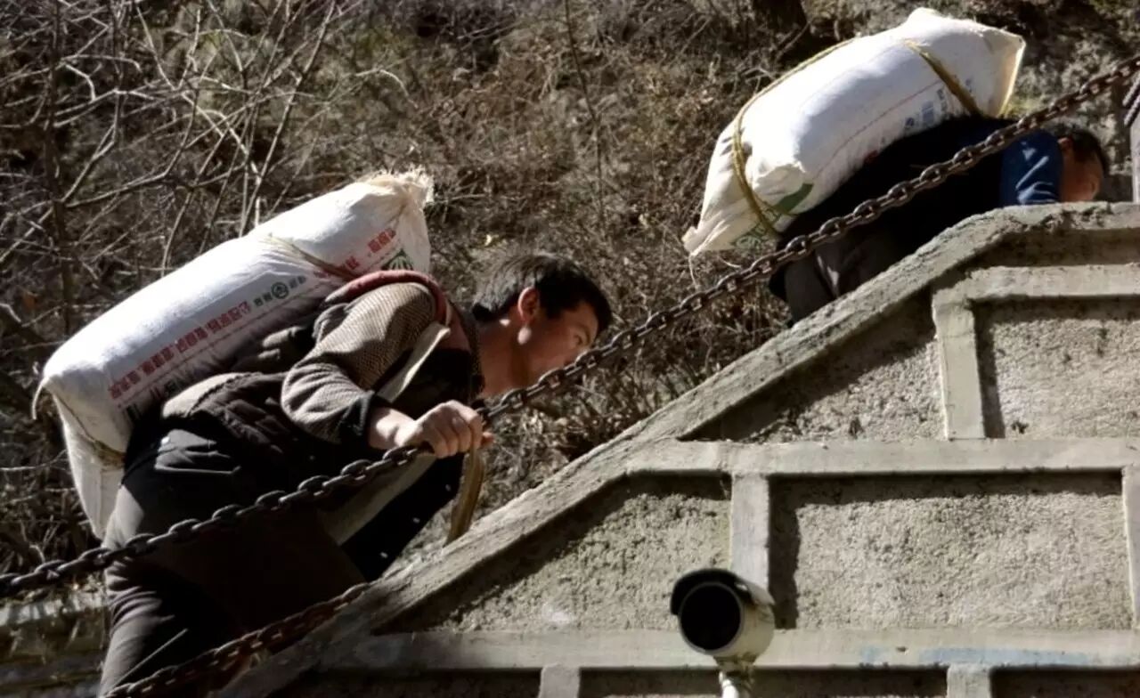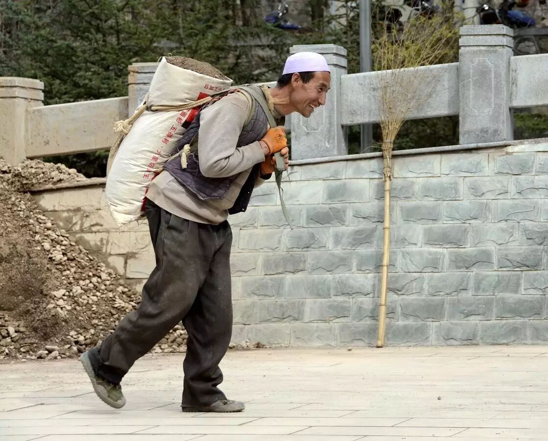 在崆峒山,碰到了一个特殊的群体——背沙工。他们大多看起来四五十岁的样子,穿着破旧,浑身沾满泥土,背上垫着厚厚的棉垫,脖子上青筋暴露,汗水顺着脸颊流淌,步履沉重,彷佛要把脚印嵌到山路中。