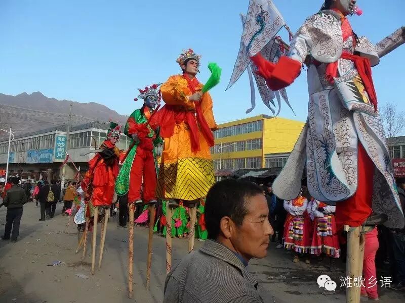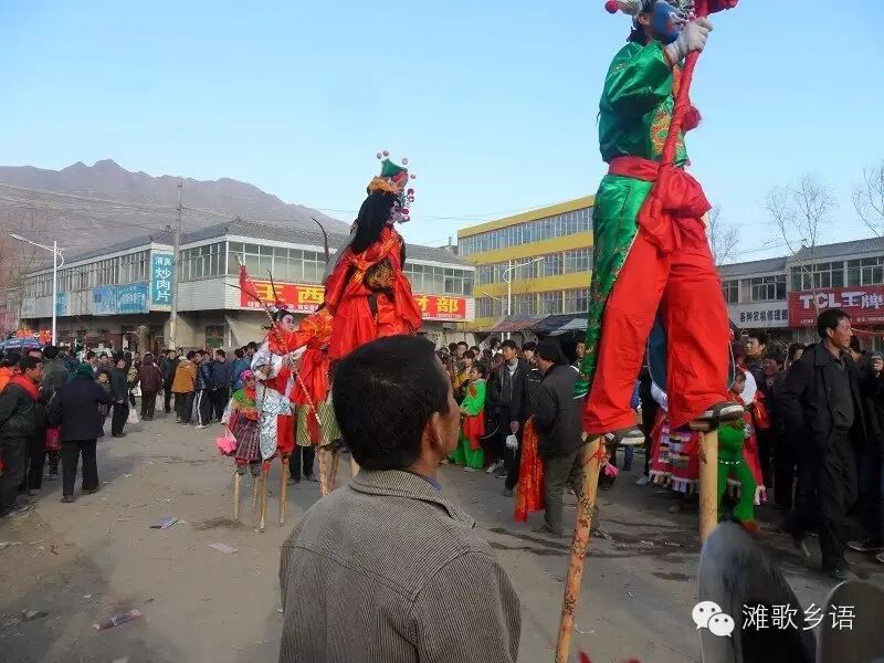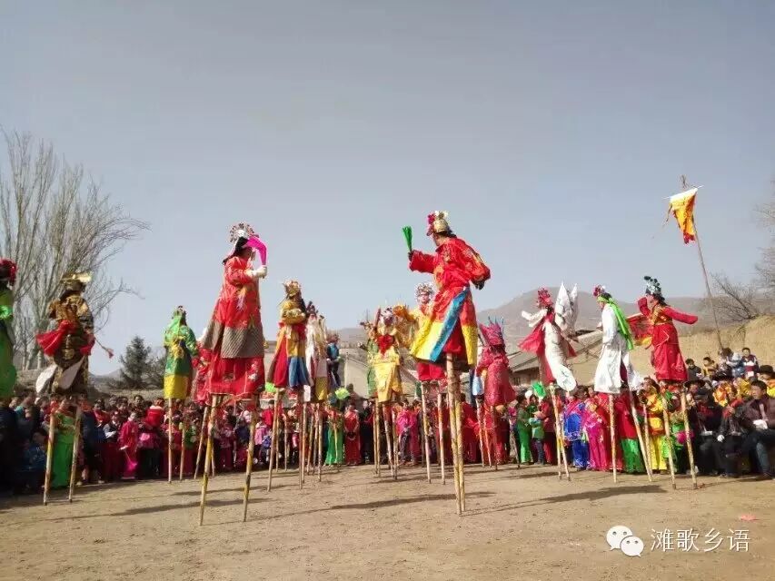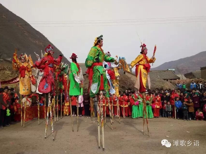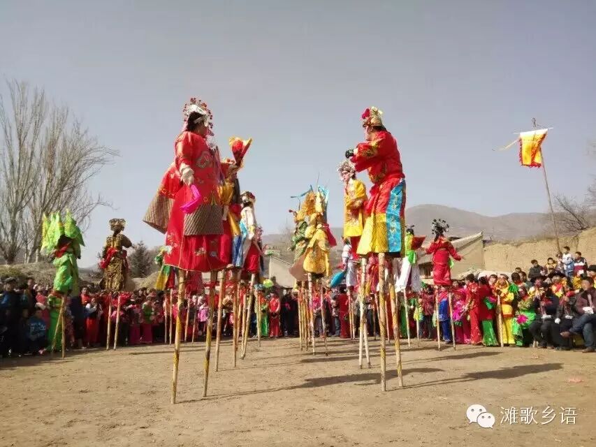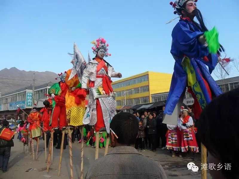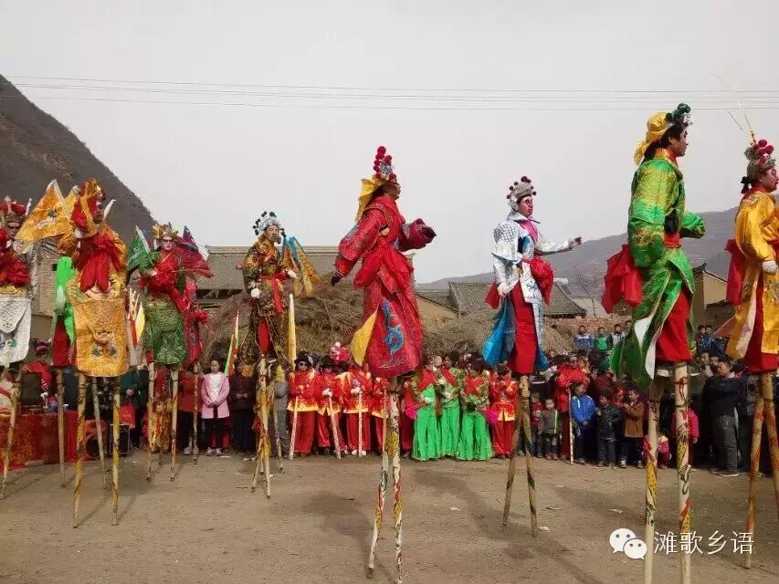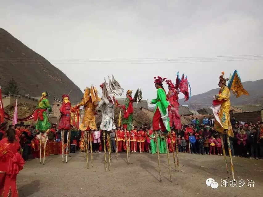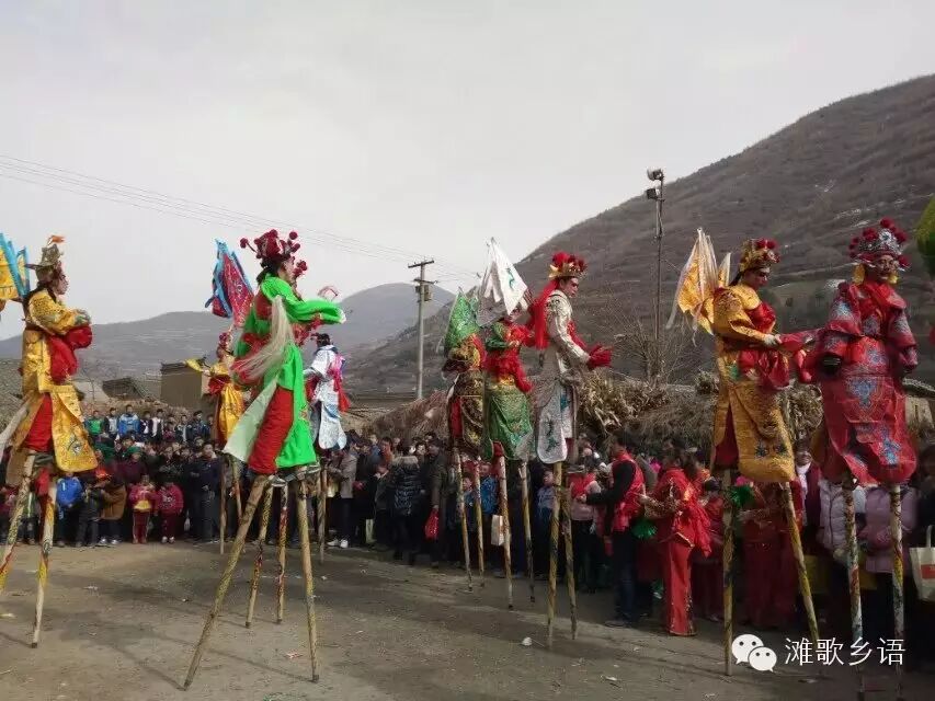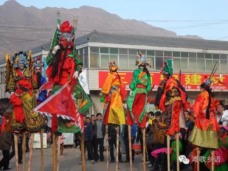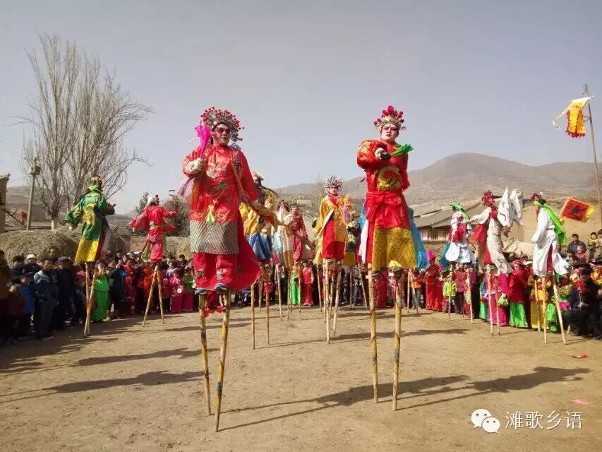 滩歌古镇的秧歌队中必不可少的表演队伍——高脚子。高脚子是脚踏着长木跷进行表演,所踩长木高越1.8米以上,多为青壮年表演,技艺性强,形式活泼多样。由于表演者踩跷比一般人高,便于远近观赏,而深受群众喜爱。高跷,由于表演者要高出一截,观众需要仰起头来或是站在高处观看,所以滩歌人称为“高节子”。这种活动在武山滩歌镇境内甚为普遍,是一种群众欢度春节的民间文艺活动形式。滩歌的“高节子”表演形式多种多样,五花八门,不拘一格。表演“高节子”的时间,一般都在农历正月初八到正月十五。扮演的身份主要是戏曲人物,最前面的是领队,也是戏曲中最重要的人物,最后是由丑汉压阵。表演首先要扭出各种姿势,表演特技主要是盍拐、碰拐。这种活动内容机动性大,行动比较自如,可以在大场中表演,也可走街串巷。