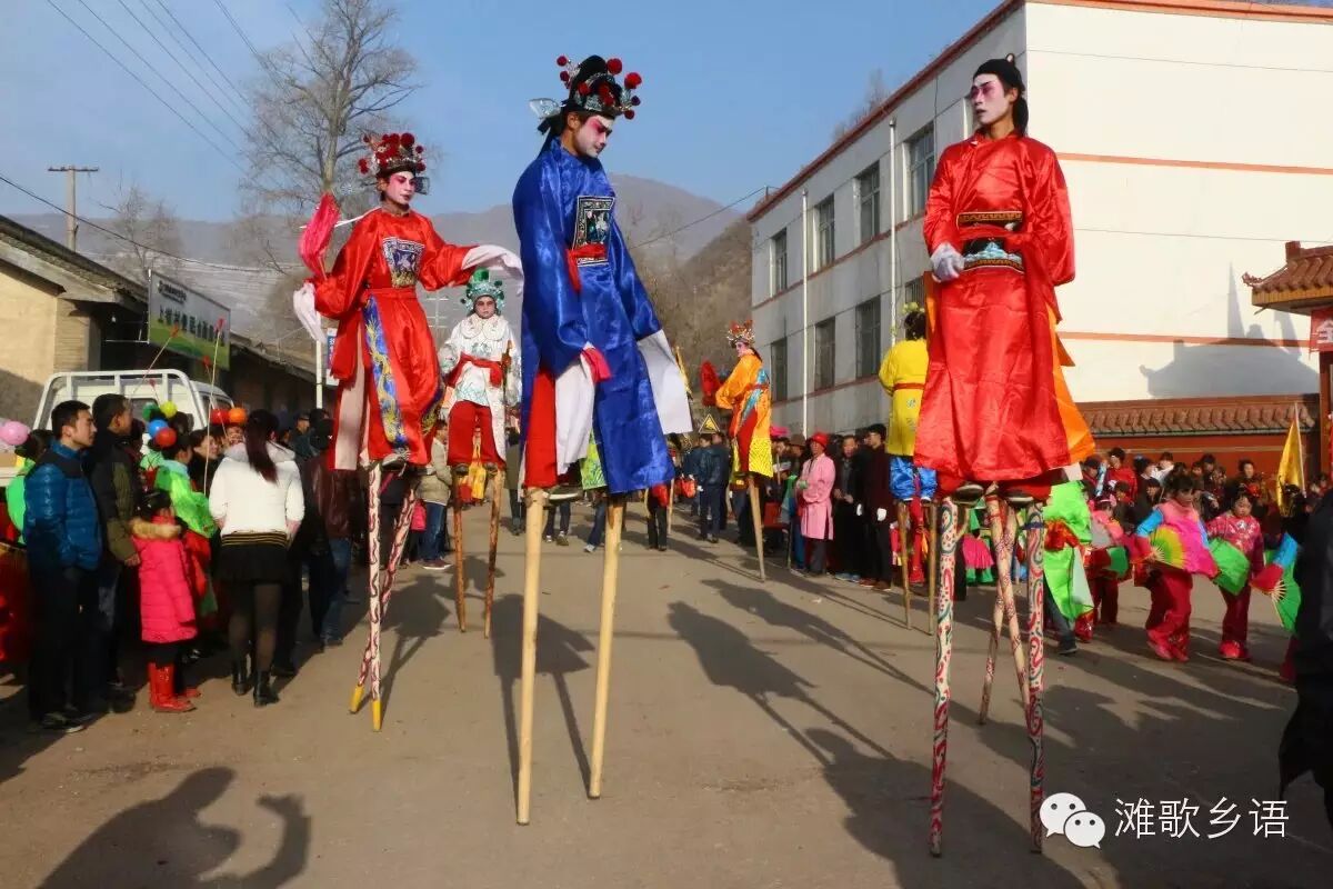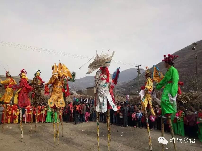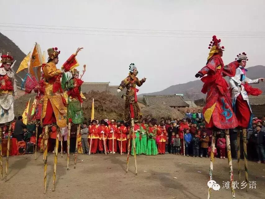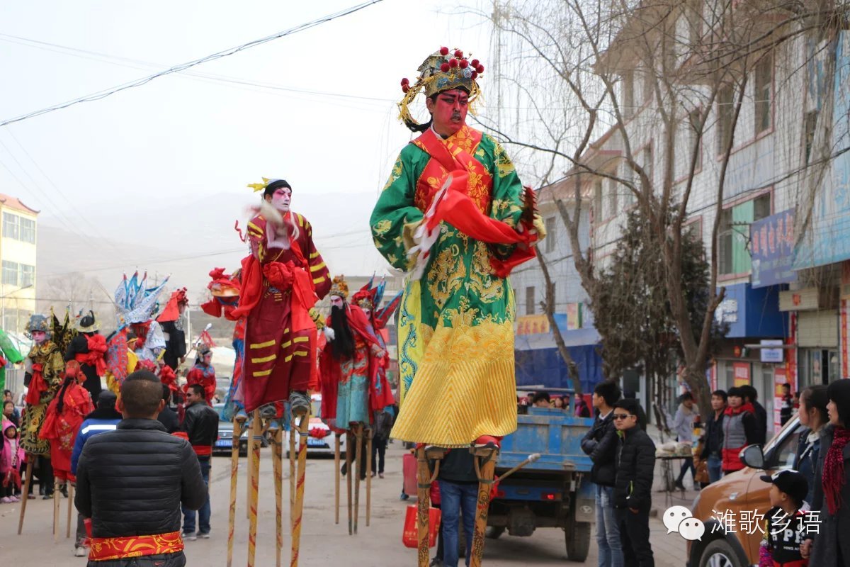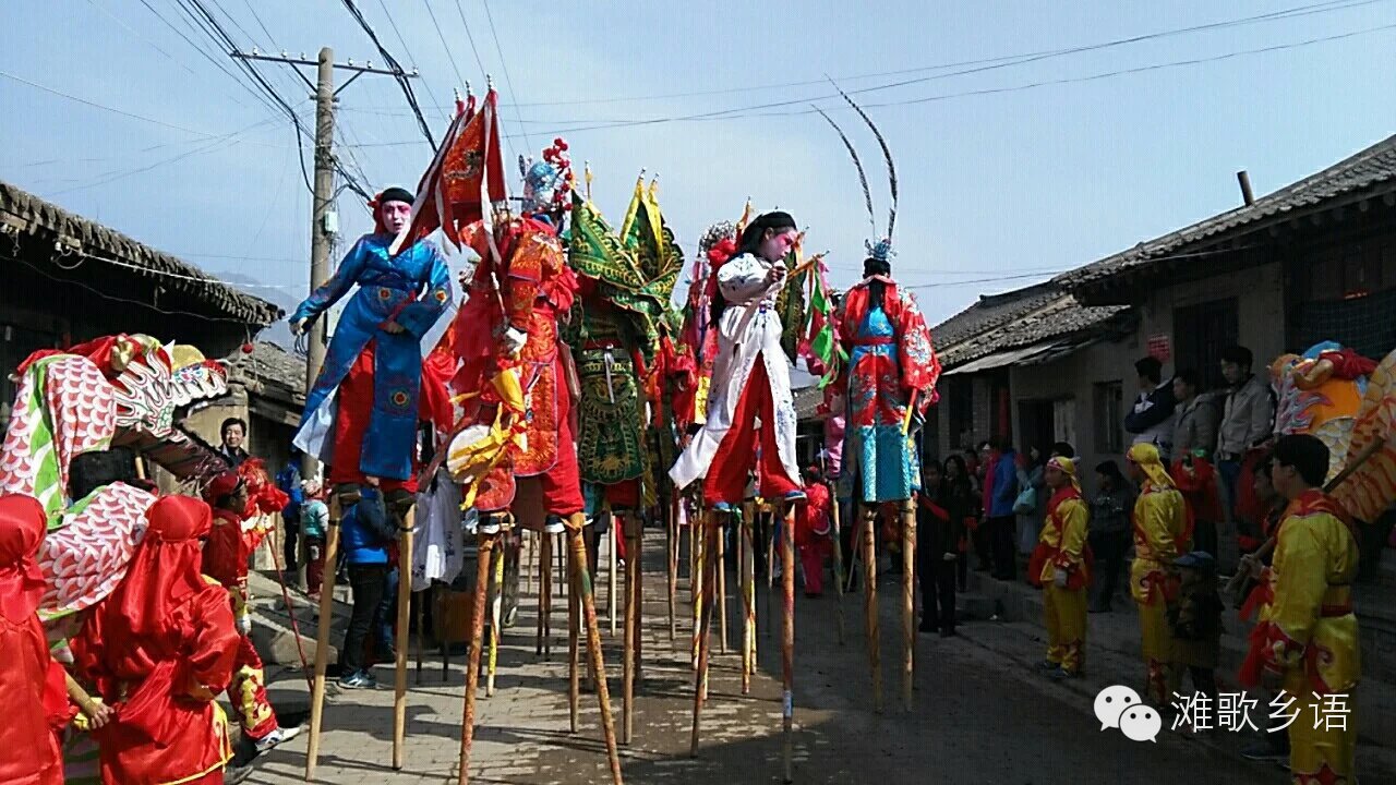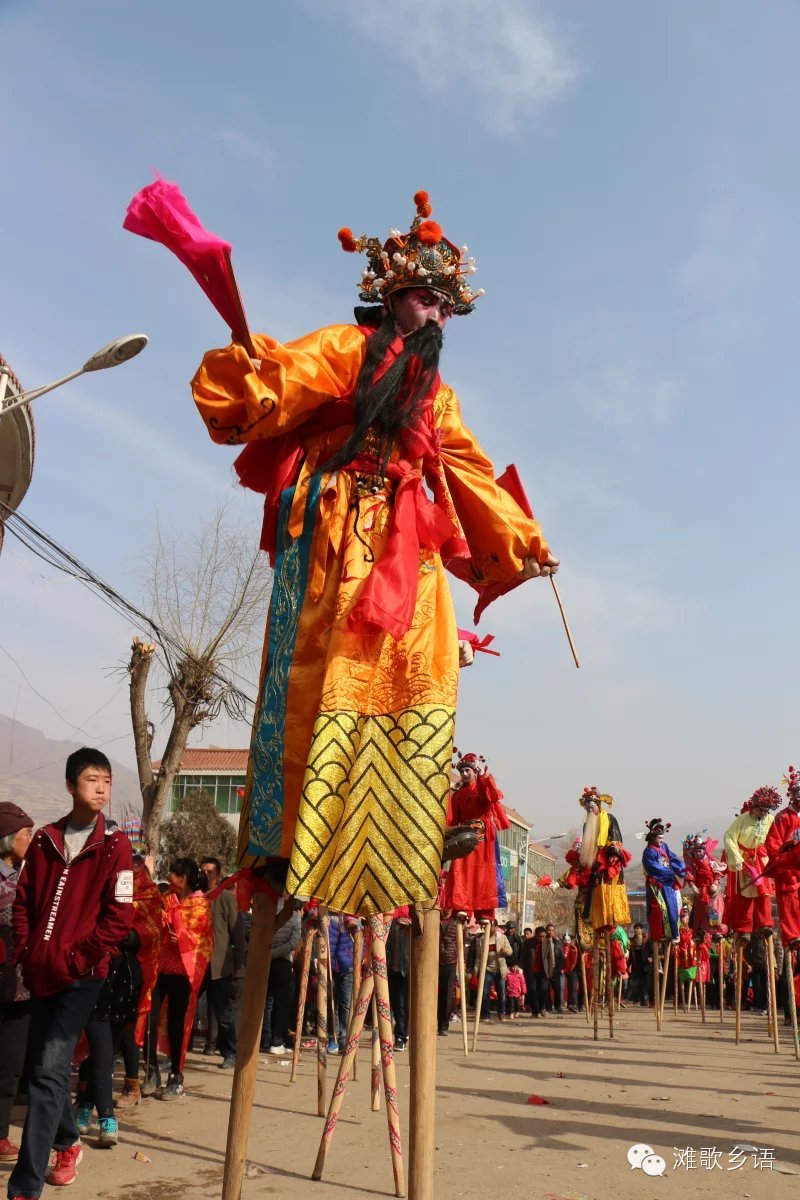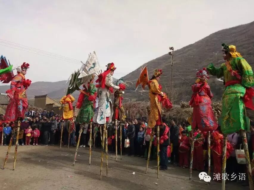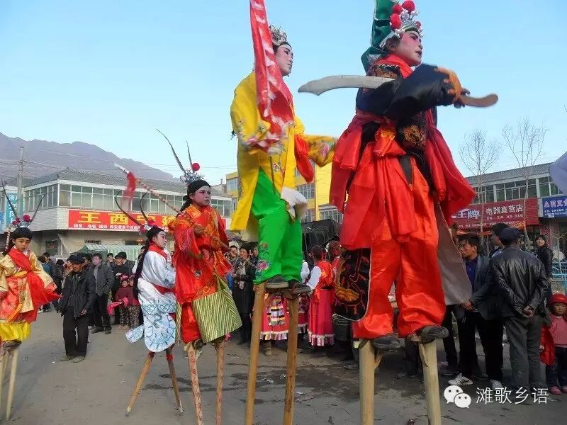 滩歌古镇的秧歌队中必不可少的表演队伍——高脚子。高脚子是脚踏着长木跷进行表演,所踩长木高越1.8米以上,多为青壮年表演,技艺性强,形式活泼多样。由于表演者踩跷比一般人高,便于远近观赏,而深受群众喜爱。高跷,由于表演者要高出一截,观众需要仰起头来或是站在高处观看,所以滩歌人称为“高节子”。这种活动在武山滩歌镇境内甚为普遍,是一种群众欢度春节的民间文艺活动形式。滩歌的“高节子”表演形式多种多样,五花八门,不拘一格。表演“高节子”的时间,一般都在农历正月初八到正月十五。扮演的身份主要是戏曲人物,最前面的是领队,也是戏曲中最重要的人物,最后是由丑汉压阵。表演首先要扭出各种姿势,表演特技主要是盍拐、碰拐。这种活动内容机动性大,行动比较自如,可以在大场中表演,也可走街串巷。