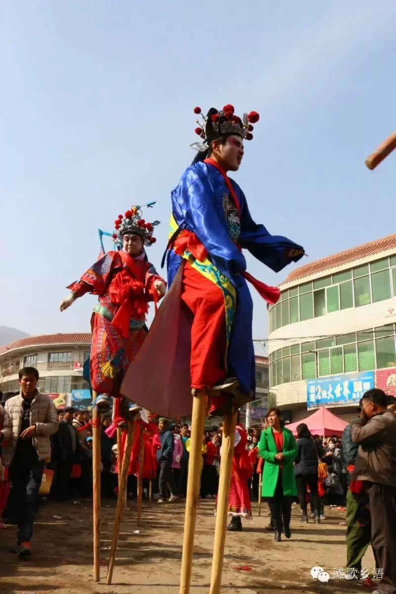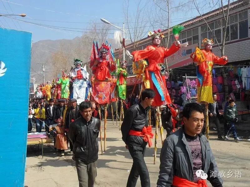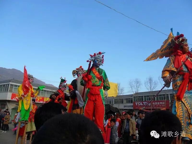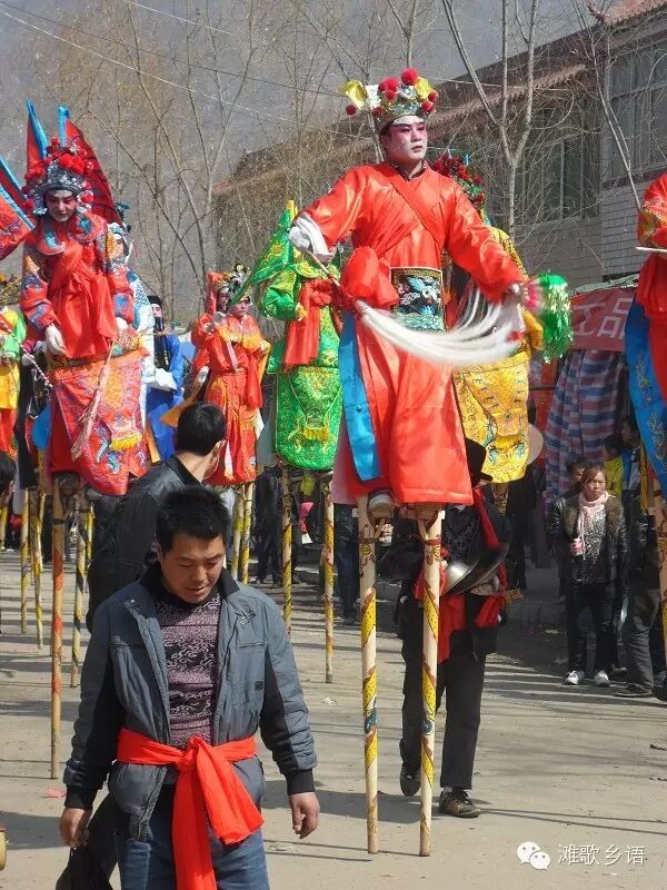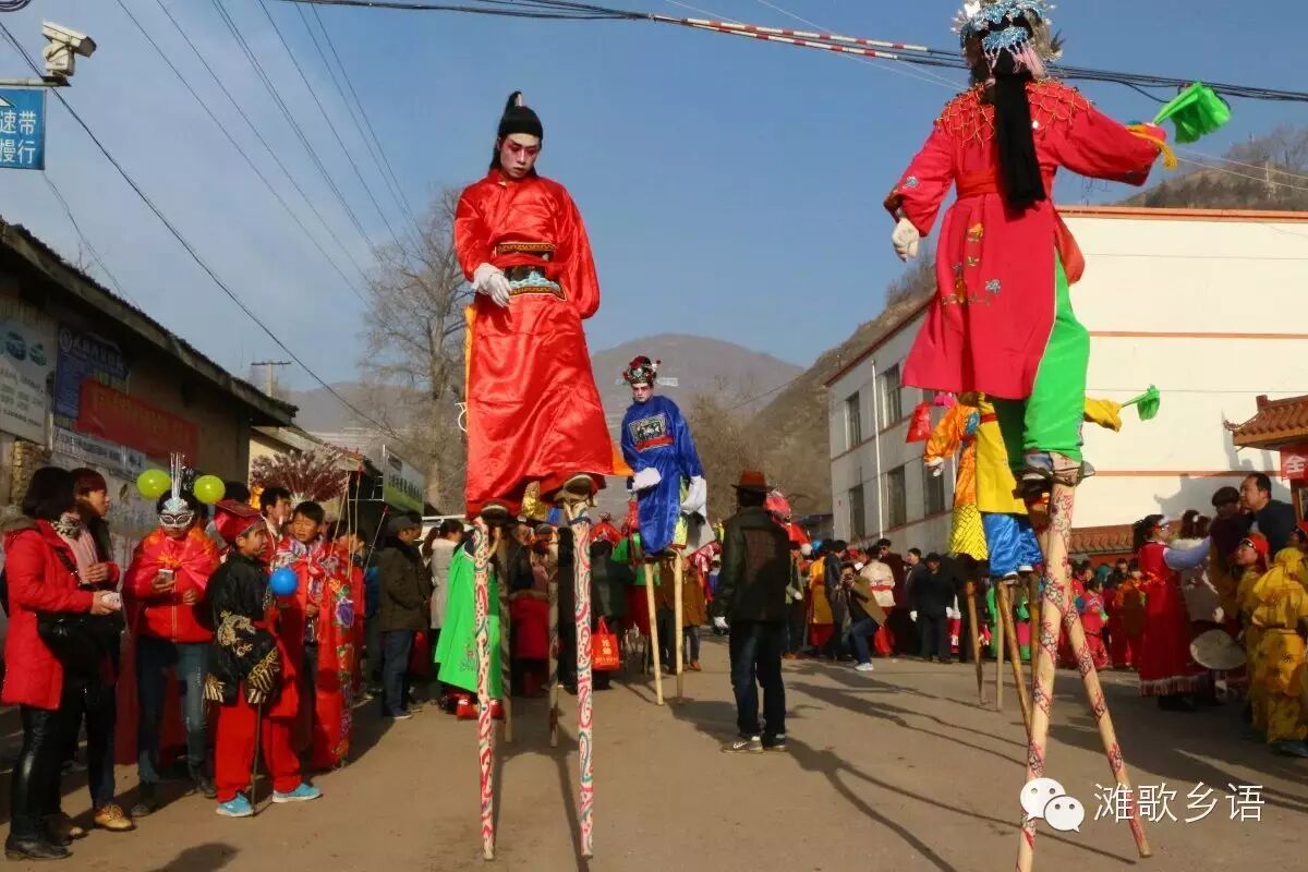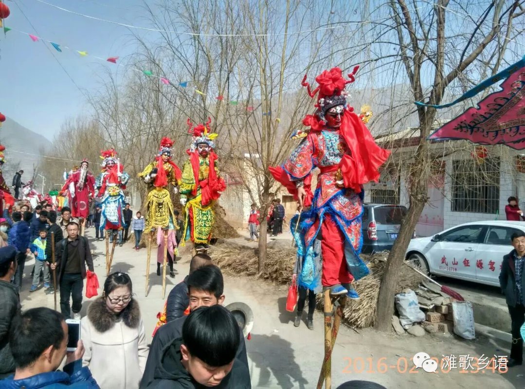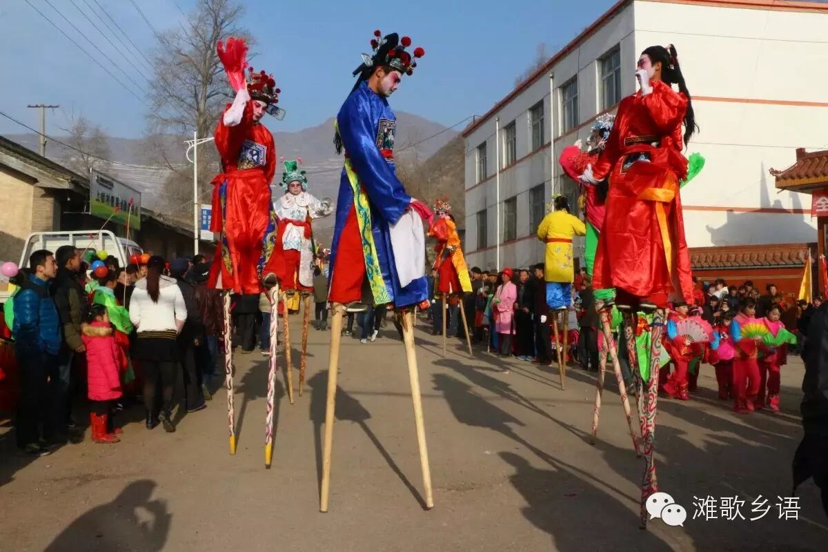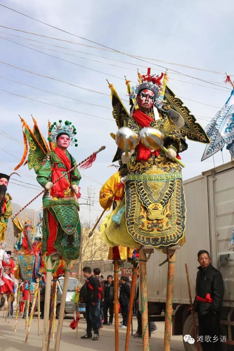 滩歌古镇的秧歌队中必不可少的表演队伍——高脚子。高脚子是脚踏着长木跷进行表演,所踩长木高越1.8米以上,多为青壮年表演,技艺性强,形式活泼多样。由于表演者踩跷比一般人高,便于远近观赏,而深受群众喜爱。高跷,由于表演者要高出一截,观众需要仰起头来或是站在高处观看,所以滩歌人称为“高节子”。这种活动在武山滩歌镇境内甚为普遍,是一种群众欢度春节的民间文艺活动形式。滩歌的“高节子”表演形式多种多样,五花八门,不拘一格。表演“高节子”的时间,一般都在农历正月初八到正月十五。扮演的身份主要是戏曲人物,最前面的是领队,也是戏曲中最重要的人物,最后是由丑汉压阵。表演首先要扭出各种姿势,表演特技主要是盍拐、碰拐。这种活动内容机动性大,行动比较自如,可以在大场中表演,也可走街串巷。