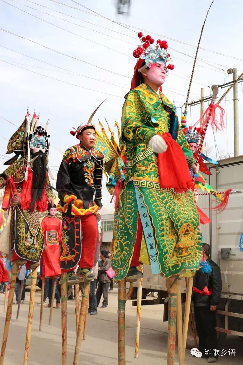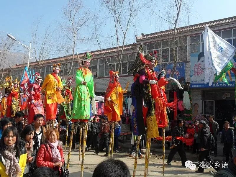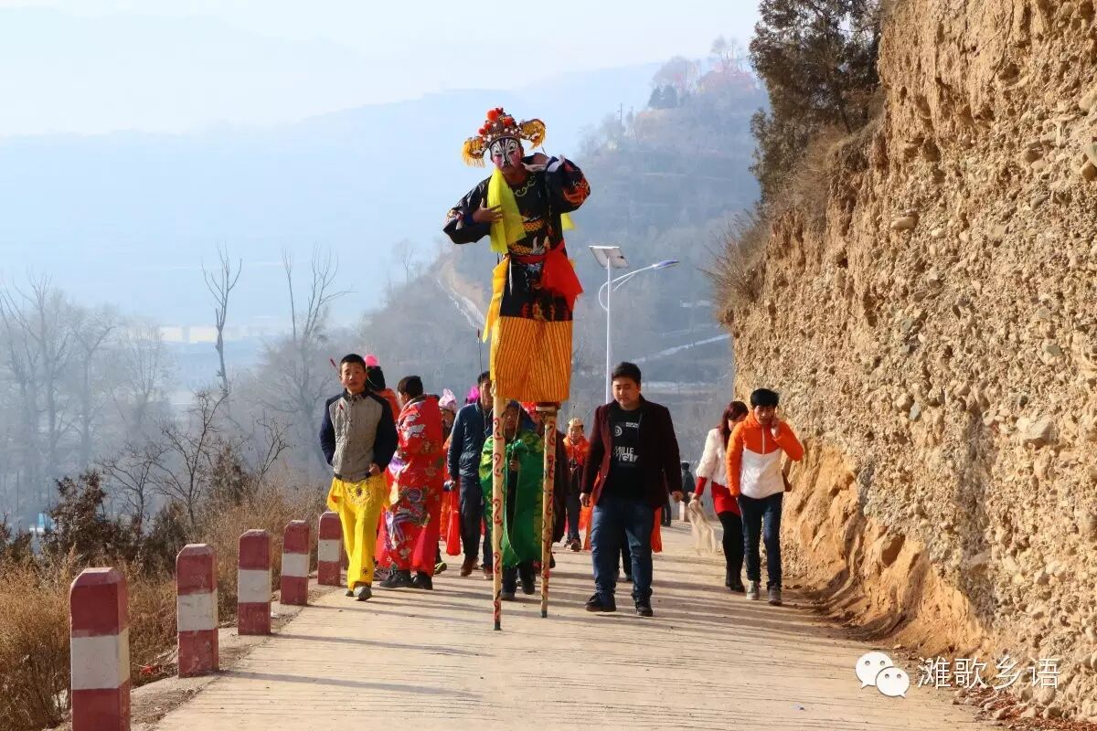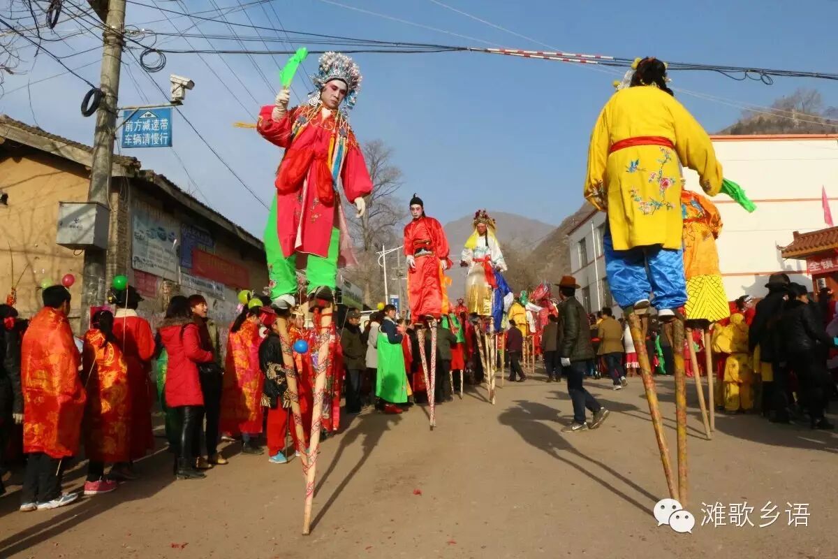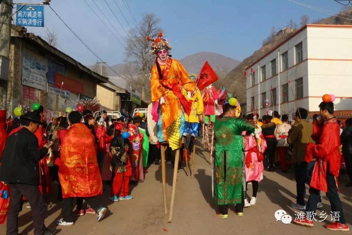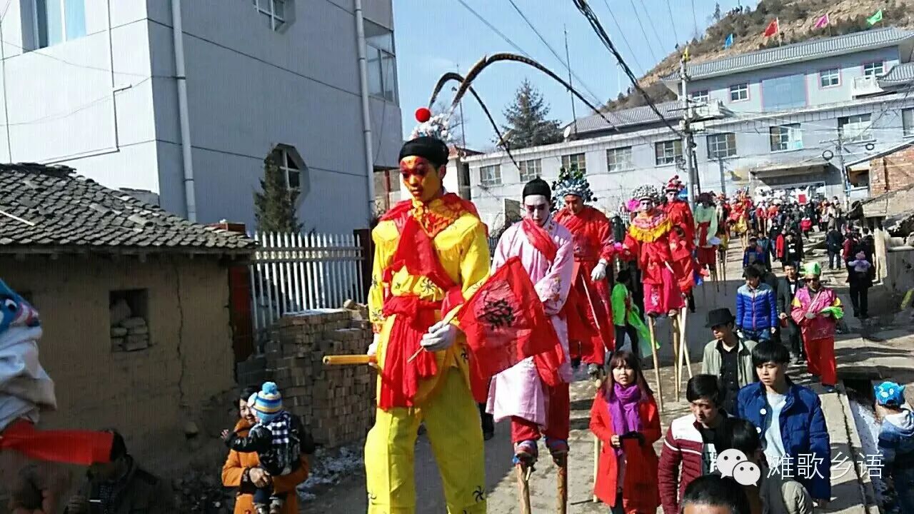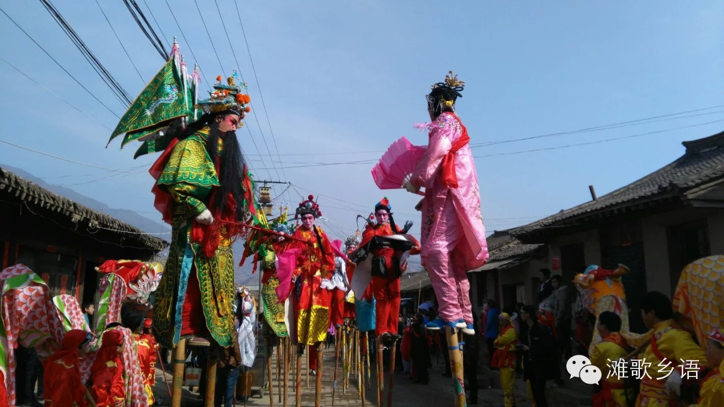 滩歌古镇的秧歌队中必不可少的表演队伍——高脚子。高脚子是脚踏着长木跷进行表演,所踩长木高越1.8米以上,多为青壮年表演,技艺性强,形式活泼多样。由于表演者踩跷比一般人高,便于远近观赏,而深受群众喜爱。高跷,由于表演者要高出一截,观众需要仰起头来或是站在高处观看,所以滩歌人称为“高节子”。这种活动在武山滩歌镇境内甚为普遍,是一种群众欢度春节的民间文艺活动形式。滩歌的“高节子”表演形式多种多样,五花八门,不拘一格。表演“高节子”的时间,一般都在农历正月初八到正月十五。扮演的身份主要是戏曲人物,最前面的是领队,也是戏曲中最重要的人物,最后是由丑汉压阵。表演首先要扭出各种姿势,表演特技主要是盍拐、碰拐。这种活动内容机动性大,行动比较自如,可以在大场中表演,也可走街串巷。