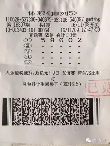 提要:11月9日,体彩排列5第16307期全国开出100注头奖,每注奖金为10万元。其中,甘肃平凉一位幸运彩友以一张65倍投、130元投入的单式倍投票拿下65注,合计揽奖650万元。