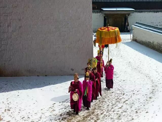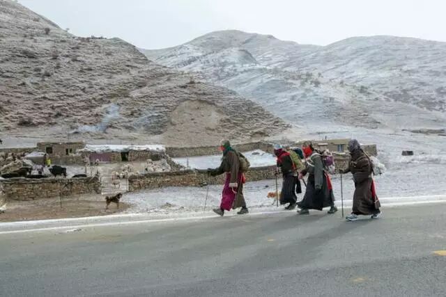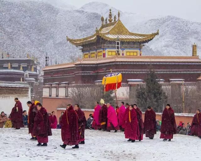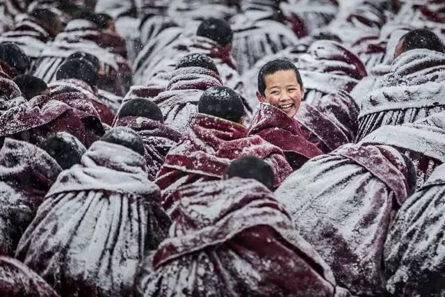 ,突遇大雪纷飞,没多久地上的雪就掩盖了鞋面。我以为身着单衣,披着斗篷,席地而坐的僧人会起来,。然而,我错了!不但没有一位僧人从冰冷的雪地站起来,冒雪前来膜拜的藏民却越来越多。,他们全然不顾风雪和寒冷,就这样默默的倾听与膜拜……