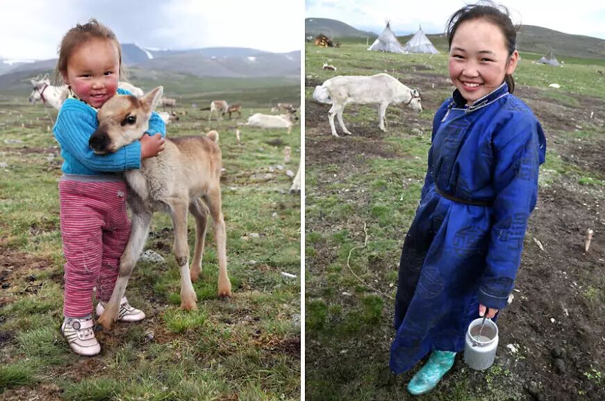 全家人自豪地和驯鹿站在一起拍照,从左至右:波洛玛、乌尔兹斯艾色格、图布辛巴亚尔、乌尔兹奇米格、纳拉胡和最年长的女儿乌尔兹萨依汗
