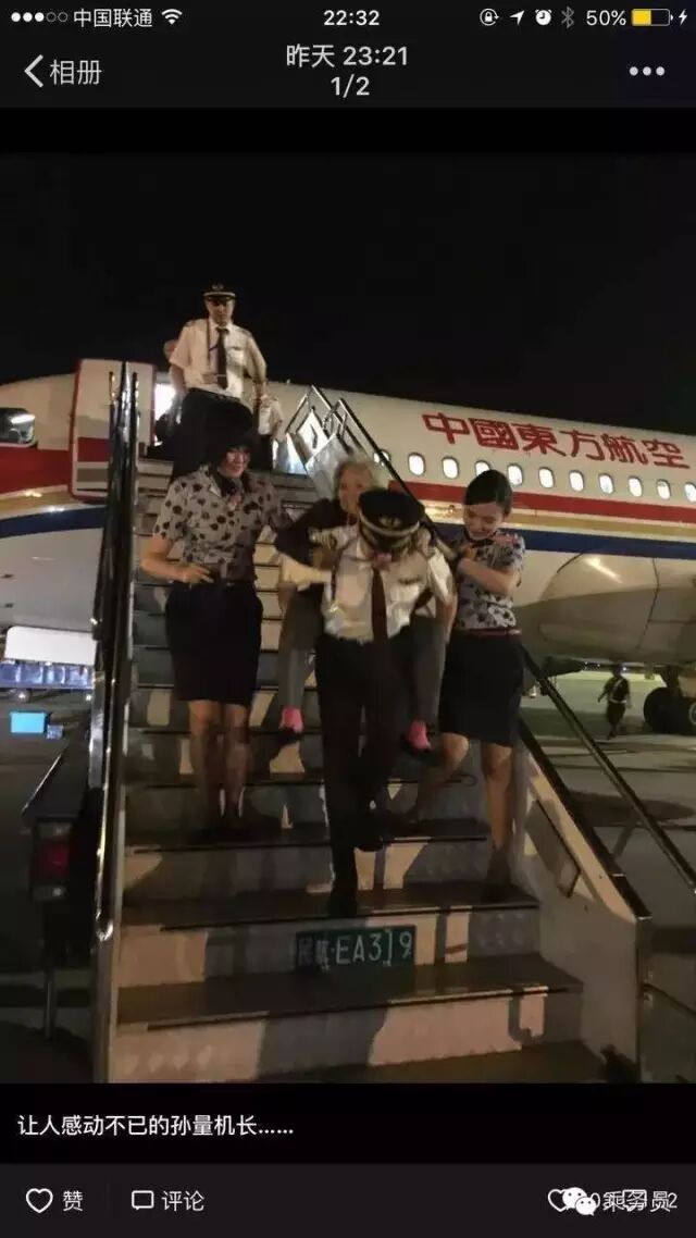 东航总部孙量机长看着乘务员和家人搀扶着老人家下楼梯依然还是不便,原本跟在身后的他,突然走到了老人身前,毫不犹豫的对老人家说:来,我背你!老人家和家人都说不用,可是机长很坚定的说:没事的,来吧,上来吧!于是有了这感动的一幕。一万个有没有!!