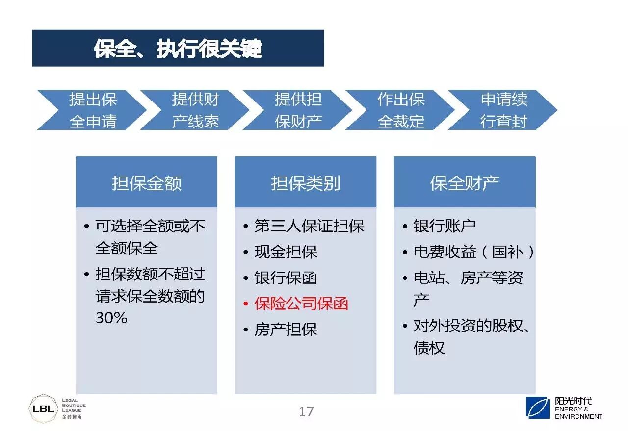 在案件处理过程当中保全、执行非常关键,,担保的数额一般来说不超过请求保全数额的30%。可以保全的财产,包括银行账户,也包括其他的电费收益,电站、房产等等,对外投资的股权、债权。