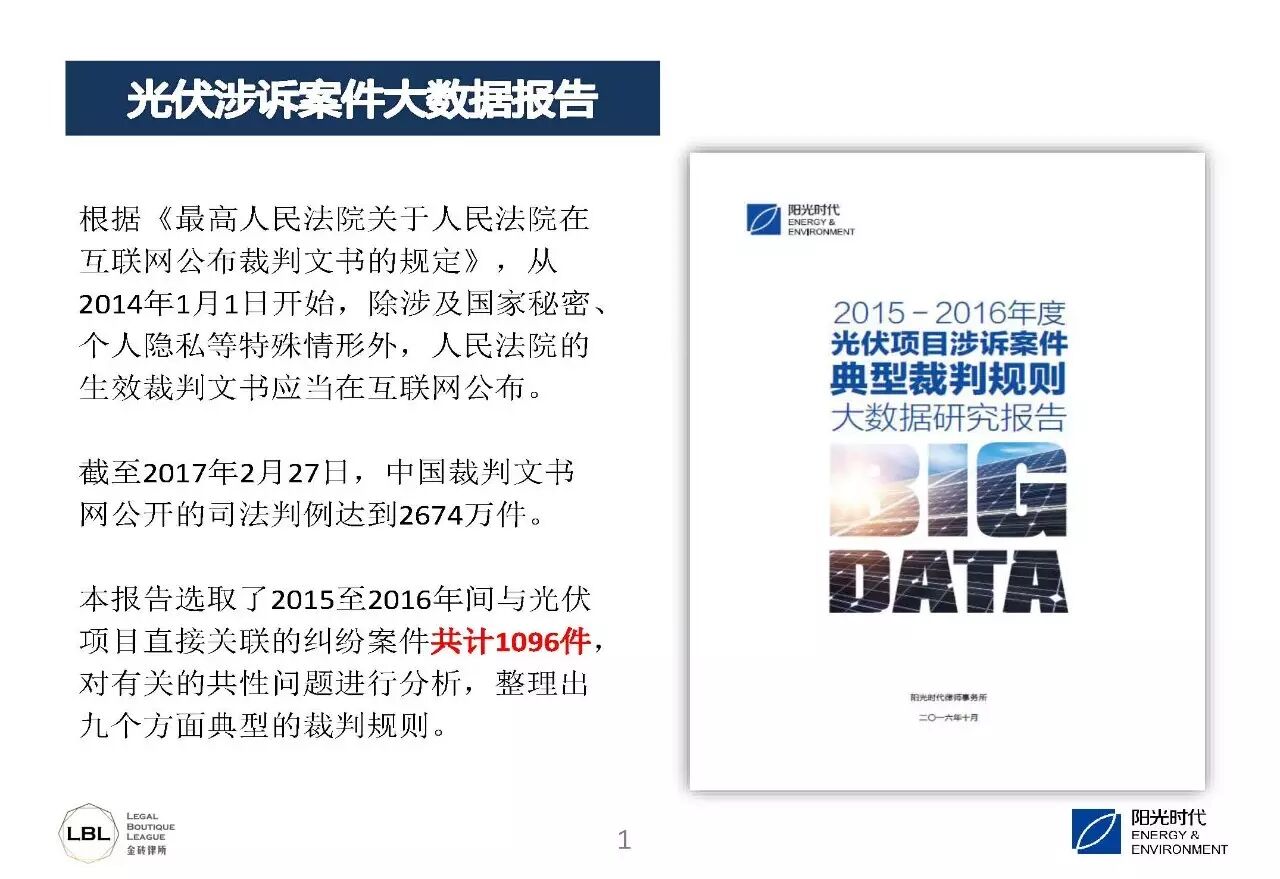 去年10月份,我们阳光所的律师做了一份司法判例大数据分析报告,对2015年到2016年度光伏项目涉及的案件做了一些统计,在这些判例当中我们选了1096件光伏案例进行分析。由于很多光伏案件是通过仲裁解决的,也有不少案件在诉讼过程中调解或者和解了,加上数据的不完整,1096这个数字远不能代表光伏案件的全部,但至少能反映出一些共性的问题。我保守估计,每年涉及光伏项目的案件至少在3000件以上,涉及标的应该在100亿以上,而且有逐年上升的趋势。