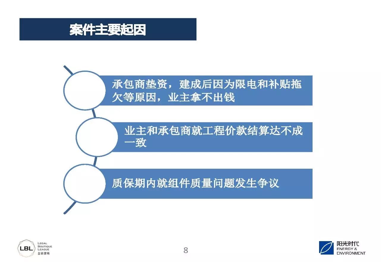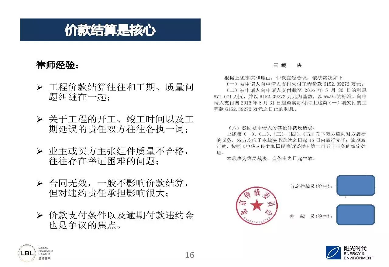 我们总结了一下,第一个是承包商垫资,第二个是业主和承包商就工程价款结算达不成一致,第三个就是质保期内就组件质量问题发生争议。