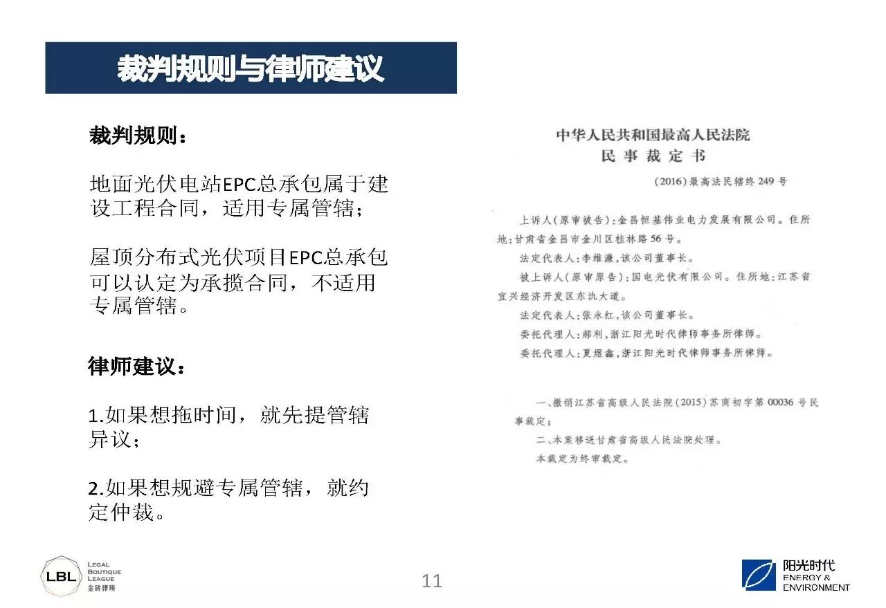 通过大数据的分析,结合我们办过的案件,我们基本上可以得出这样的裁判规则:地面光伏电站EPC总承包属于建设工程合同,适用专属管辖,屋顶分布式光伏项目EPC总承包可以认定为承揽合同,不适用专属管辖。如果想规避这个专属管辖,你也可以约定仲裁,比如你约定EPC总承包合同发生纠纷后由某仲裁委员会处理,就可以突破专属管辖的问题。