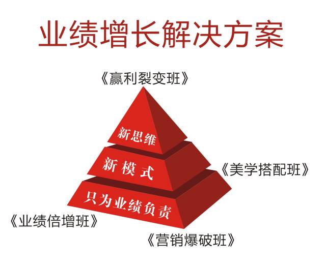 业绩增长解决方案:《业绩倍增班》《赢利裂变班》《营销爆破班》《美学搭配班》《人才孵化班》。