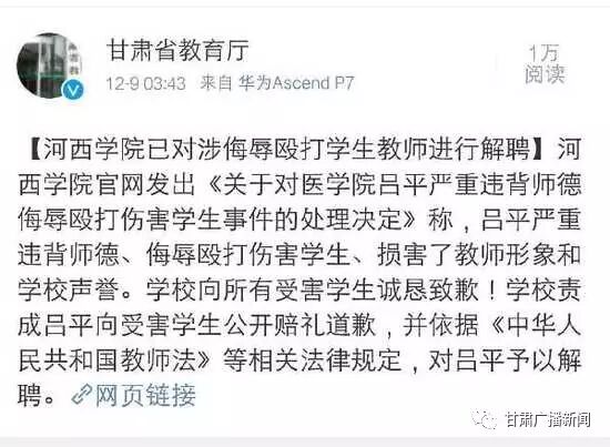 今天,甘肃省教育厅官方微博转发消息称,河西学院官网发出《关于对医学院吕平严重违背师德侮辱殴打伤害学生事件的处理决定》。