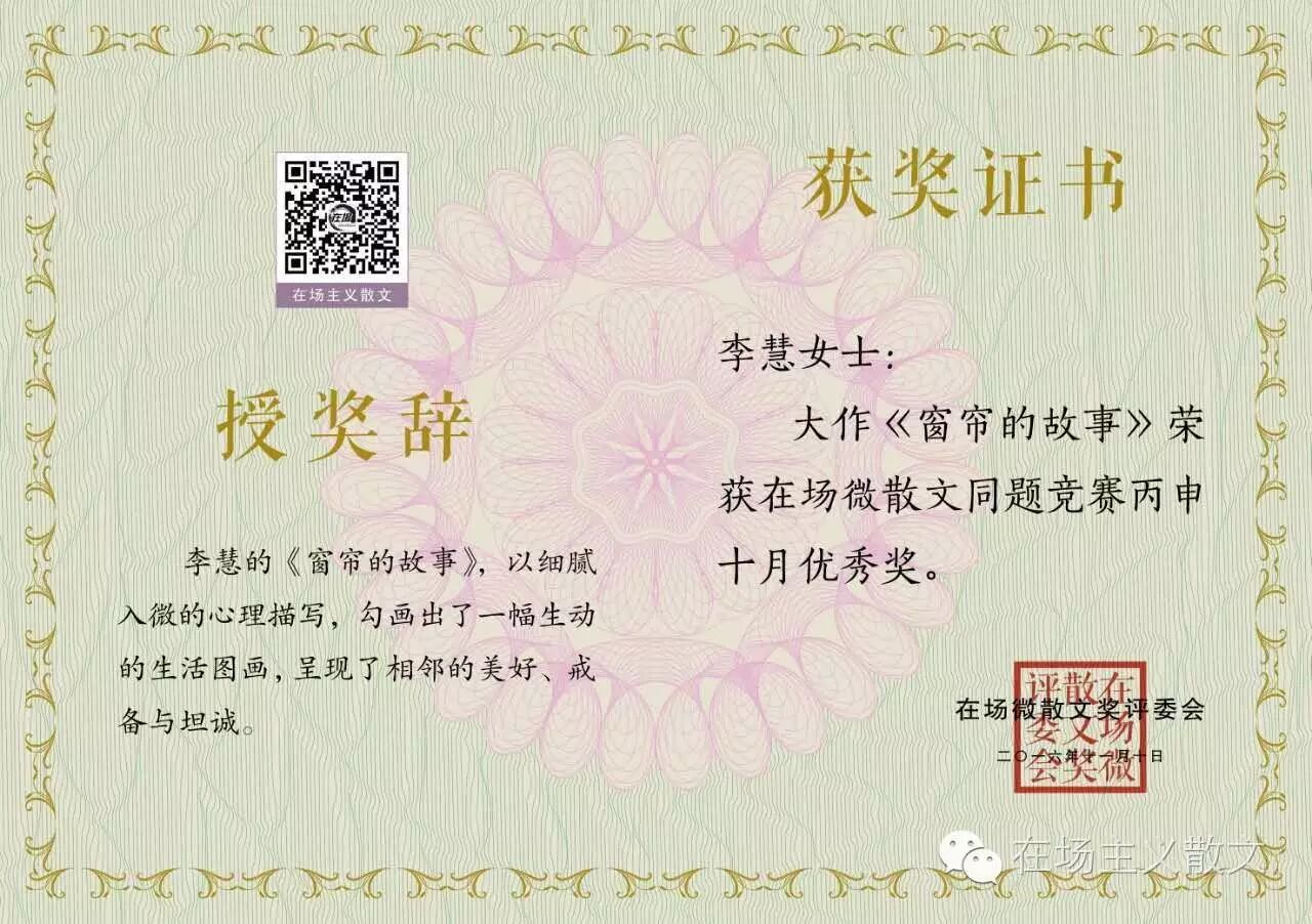 6.李慧 《窗帘的故事》,以细腻入微的心理描写,为我们勾画出了一幅生动生活图,呈现了相邻的美好、戒备与坦诚。