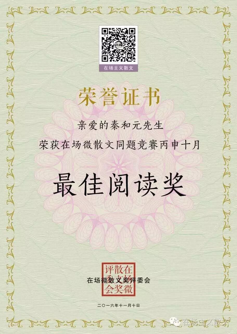 秦新法:万没想到我的微散文会获奖,深知自己缺乏文字功底和基础,对微散文更是像小学生似的在摸索着习练。近来我因身体和生存同时出了问题,心情颇不平静,因而错过了今晚的评奖。当晓来老师告诉我时,我正在忙小室的卫生,首先,对错过评奖深感歉疚,继而对我的文字获奖感觉虚幻得不真实,可无疑的是真真实实获了奖。感动中,由衷感谢《在场微散文》各位老师对我的关注和鼓励,我将继续努力,尽力写出用心血浇铸的文字。