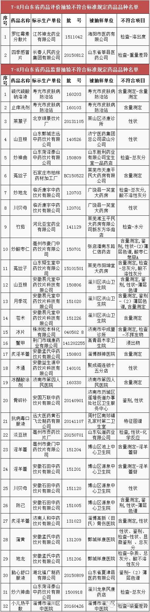 9月27日,山东省药监局发布2016年第7期药品质量公告,共34批次药品抽验不合格。