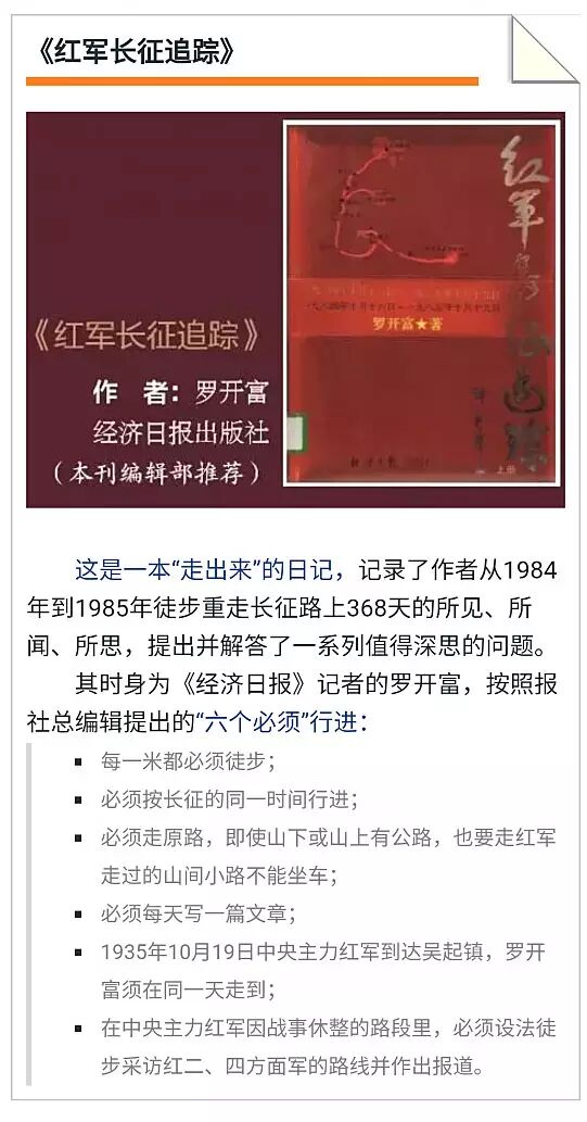 ◆ 这10本书,由瞭望周刊社与中央党史研究室第一研究部共同遴选而得,排列以长征结束后亲历者第一时间回忆、历史学者的研究成果、长征图片和历史资料为序,后附题记