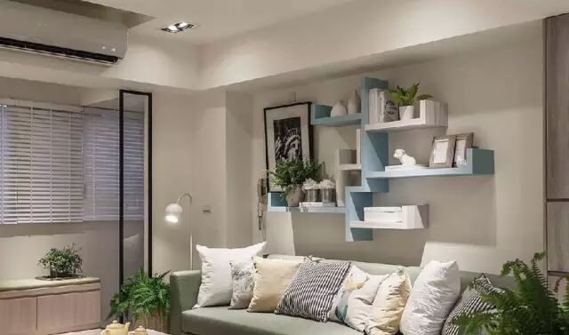 以隔板打造出大树意象的收纳柜,蓝白配色与绿色沙发相呼应,创造出和谐的视觉效果。