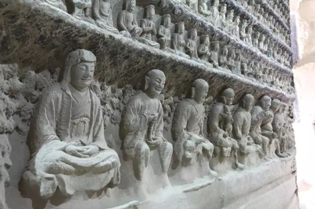 钟山石窟群,现存大小洞窟18座,目前发掘了9座,但开放参观的只有6座。石窟的精华部分集中在第三窟,这里是石宫寺的大雄宝殿。只见陡直的石壁上开凿出三个长方形的窟门,正中门洞上方,刻三个篆字“万佛岩”。进得洞中,迎面三尊大佛端坐于一米多高的莲台之上,每尊大佛身边都环立着弟子像,有的还有胁持菩萨像。八根一米见方的石柱,支撑起高达5.5米的穹顶,石柱上雕满大大小小的佛像,四壁也是密密麻麻造像森列,置身其间,仿若步入了佛国胜境。