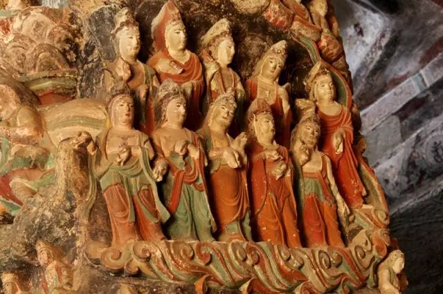 说到造像之美,钟山石窟确实看点多多。这里的菩萨绚丽多彩,婀娜多姿,显然是最夺眼球的。在莲台上有两尊胁持菩萨,身高略低于两位大弟子,但也高达两米多。左边的菩萨头戴花冠,面容俊俏,衣带飘垂,腰肢侧倚。可惜双臂已残,我们只能通过想象来弥补其曼妙的身姿了。右边的菩萨是全窟的美神,头上花冠高耸,中心有一小佛像,这应是观音菩萨的“标配”。微微颔首,似笑含羞,斜倚腰身,凸显曲线,胸前佩戴珠宝璎珞,腰间轻系红色飘带。右手已残,左手做说法印,跣足立于莲台上,其神态其身形其服饰其色彩,真是令人一见倾心。