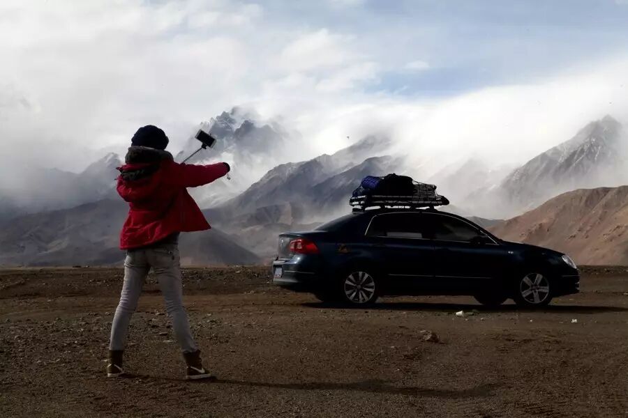 在这里静静的感受阳光带给我的温暖,身后无名湖吹来的小风,轻轻地吹打在我的脸上,那时候的感觉就是幸福、惬意、无忧无虑。玩了十五分钟,居然一辆车都没有经过这,又是一件不可思议的事情。路还是要继续走的,只希望接下来的风景,能再给我点惊喜,让我不虚此行。可是,接下来我们在这神奇的新藏线上连续行驶了两个小时,期间也没有任何可以打动我的地方,就在无比乏味之时,水墨画般的风景突然在一个弯道后出现了,简直可以用“神秘”来形容,云雾在连绵的青山缠绕,相互依存、若隐若现。大家纷纷与这般美景合影,就连不大喜欢拍照的搭车妹子也加入自拍的行列。