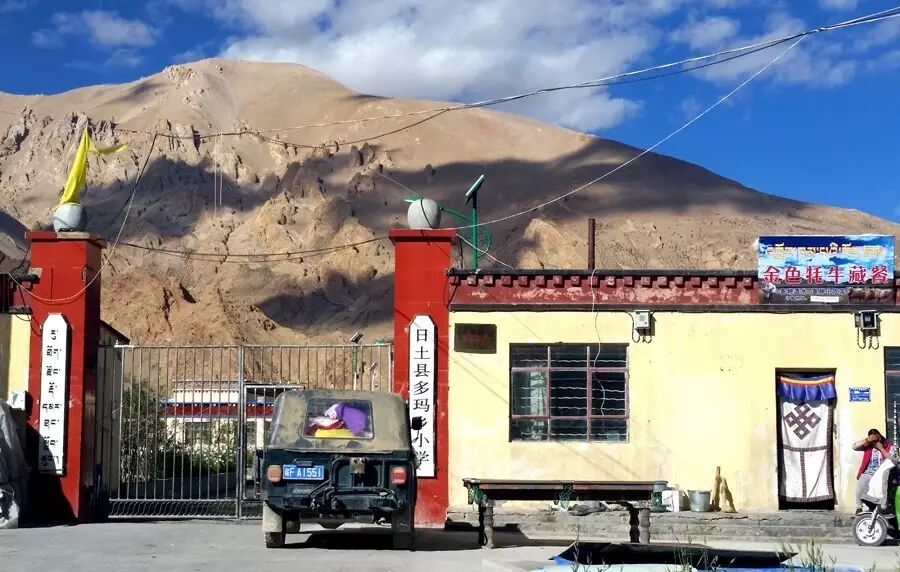 由于这里无法吃早饭,所以我们只能开车到多玛乡去吃,此时已经是上午的11点,这哪里是早饭,分明就是中午饭,我认为现在的我们在中国最西部生活,应该把时差调整6个小时。这里有一处背靠土山的小学校,看来条件不是很好。