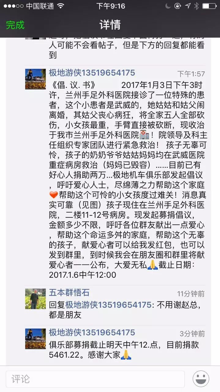 兰州摩友们得知后也没有坐视不管,大家纷纷自发组织爱心捐助。其中兰州极地游侠俱乐部、兰州摩途摩托车俱乐部、兰州布鲁斯机车俱乐部、兰州复古机车联盟等发动摩友们奉献爱心。