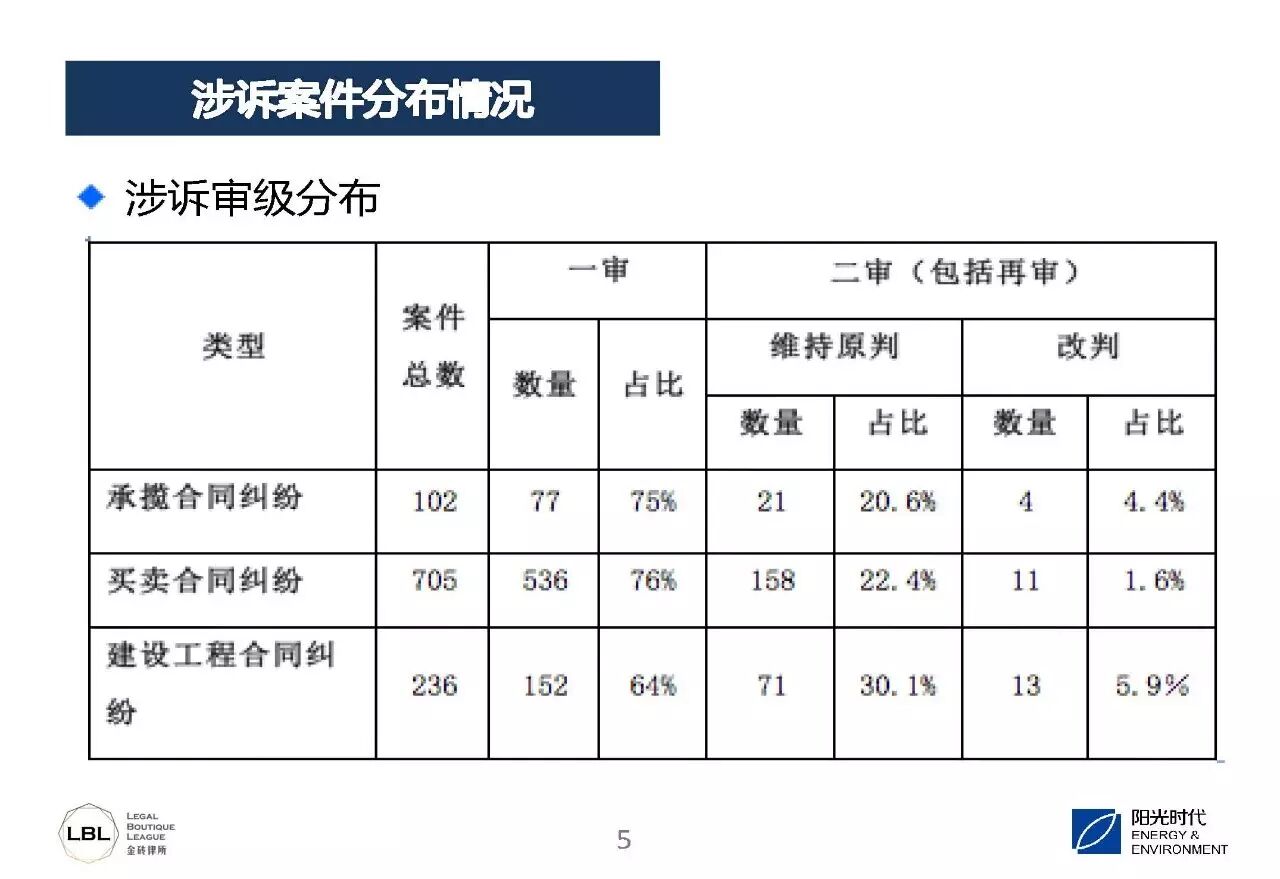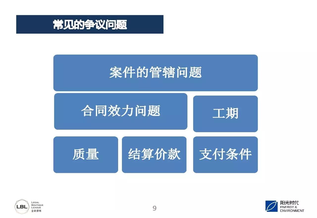 我们总结了一下,第一个是承包商垫资,第二个是业主和承包商就工程价款结算达不成一致,第三个就是质保期内就组件质量问题发生争议。