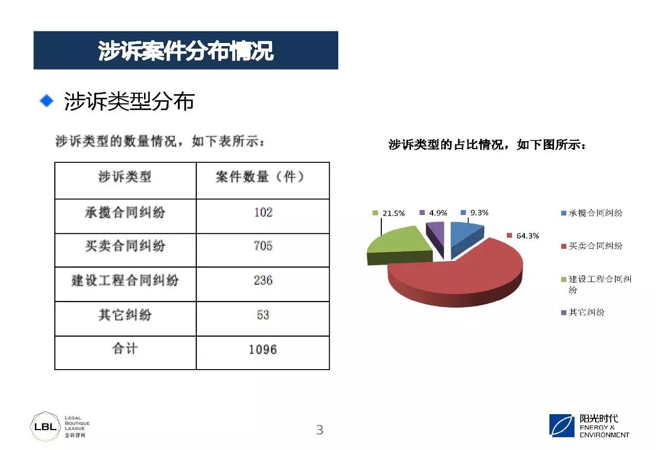 去年10月份,我们阳光所的律师做了一份司法判例大数据分析报告,对2015年到2016年度光伏项目涉及的案件做了一些统计,在这些判例当中我们选了1096件光伏案例进行分析。由于很多光伏案件是通过仲裁解决的,也有不少案件在诉讼过程中调解或者和解了,加上数据的不完整,1096这个数字远不能代表光伏案件的全部,但至少能反映出一些共性的问题。我保守估计,每年涉及光伏项目的案件至少在3000件以上,涉及标的应该在100亿以上,而且有逐年上升的趋势。