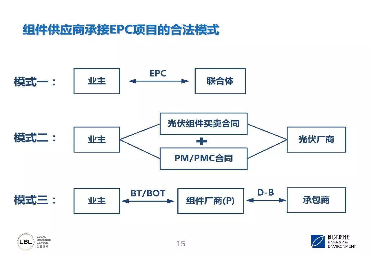 对于很多组件供应商来说,一个更困惑的问题出现了,没有资质,又想做光伏EPC总包。怎么办呢?第一是找有资质的企业组成联合体,共同承担EPC,当然业主要同意;第二如果有相应的项目管理的资质,你可以签署一个项目管理的合同加组件买卖的合同;第三是可以和业主之间签BT、BOT的合同,再以D-B方式发给承包商。这些都是破解的办法。